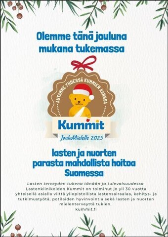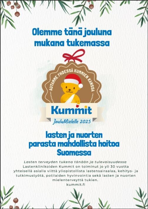 Tänä Jouluna olemme mukana tukemassa Lastenklinikoiden Kummien toimintaa.